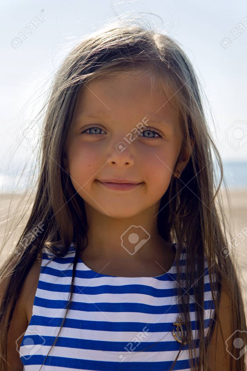ストライプの青いドレスの長い髪の女の赤ちゃん の写真素材 画像素材 Image